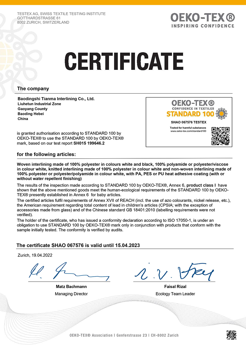 Пройдена сертификация ОЕКО. Может также использоваться для детской одежды. Сертификат OEKO-TEX® удостоверяет, что перечисленный в нем товар успешно прошел лабораторные исследования в соответствии с требованиями сертификации по стандарту STANDARD 100 by OEKO-TEX®. Преимущество данного сертификата - это отсутствие вредных веществ для здоровья человека и экологическая безопасность на всех этапах производства.