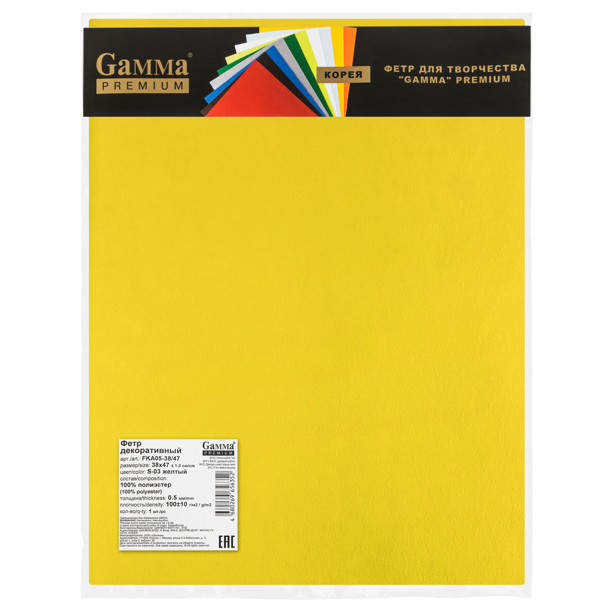 Фетр "Gamma" Premium FKA05-38/47 декоративный 0.5 мм 38 см х 47 см S-03 желтый