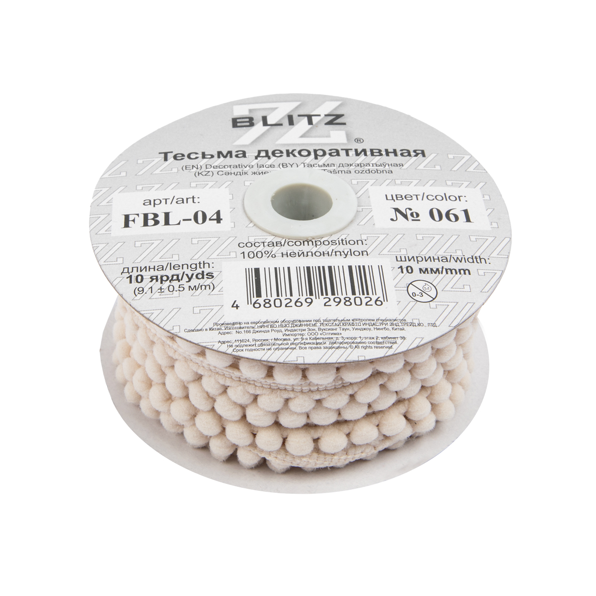 "BLITZ" тесьма декоративная FBL-04 10 мм 9.1 м ± 0.5 м №061 св.св.бежевый