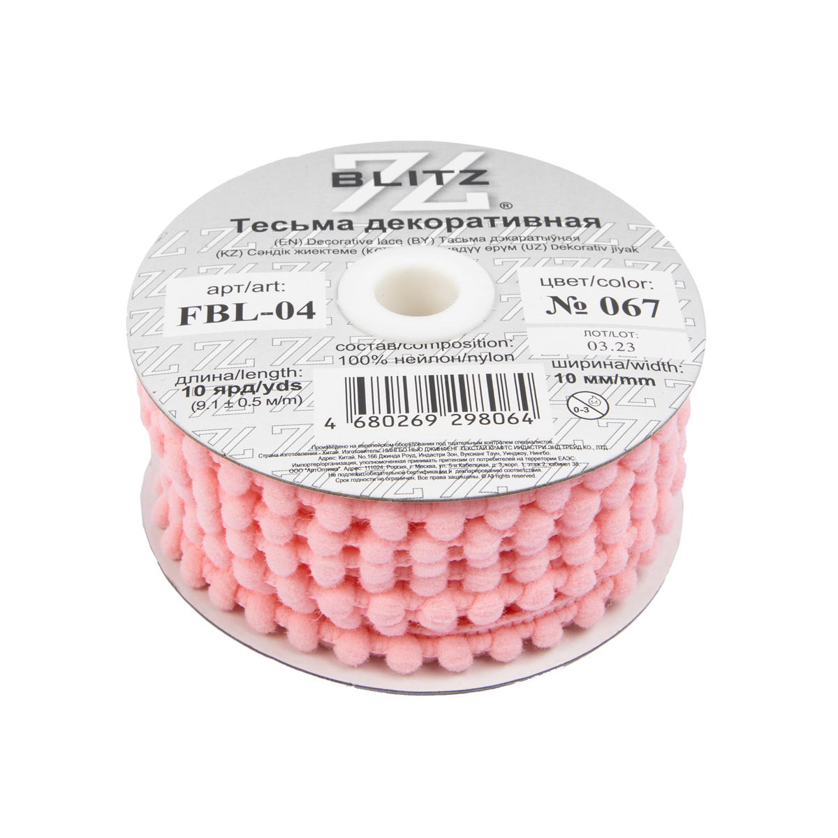 "BLITZ" тесьма декоративная FBL-04 10 мм 9.1 м ± 0.5 м №067 св-розовый
