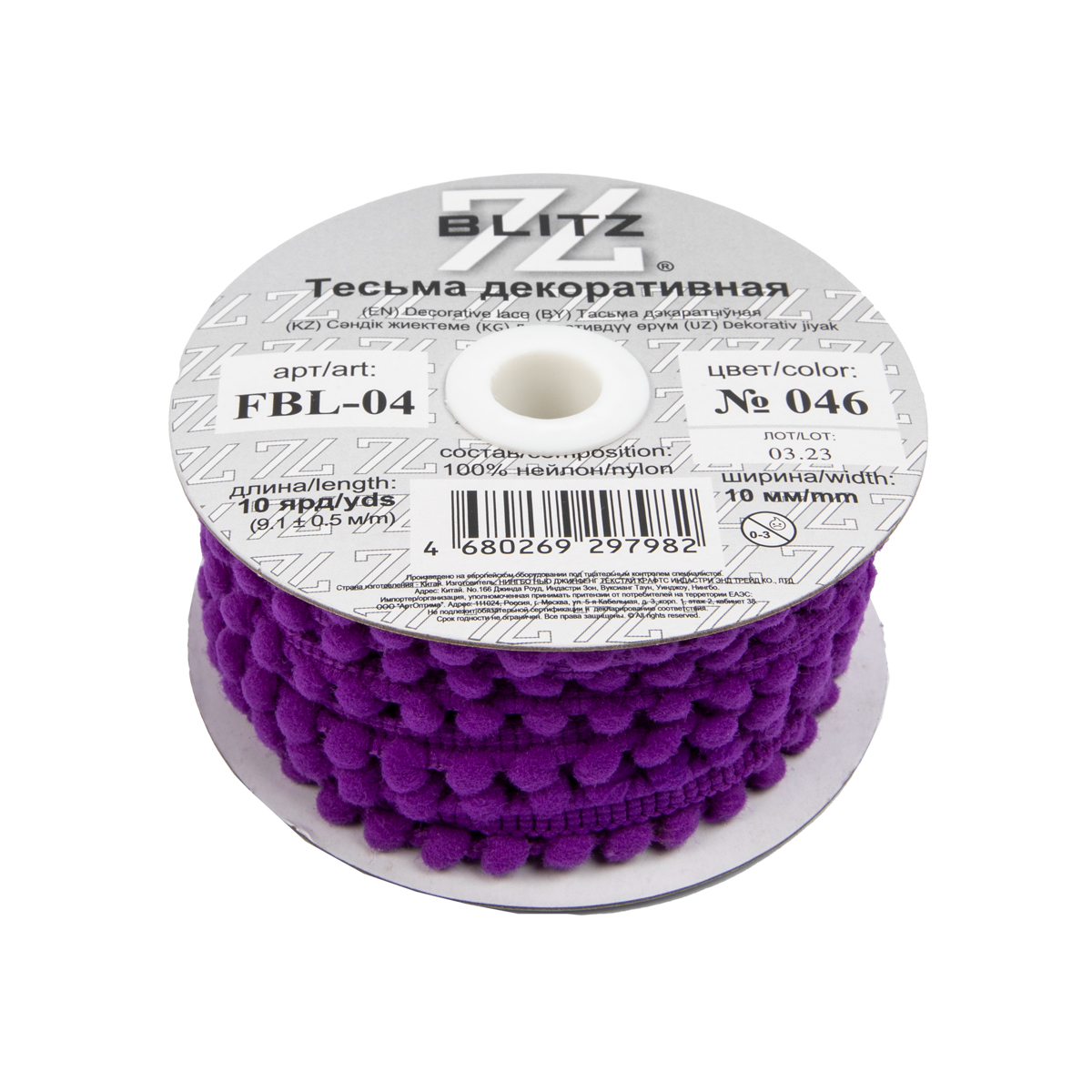 "BLITZ" тесьма декоративная FBL-04 10 мм 9.1 м ± 0.5 м №046 лиловый