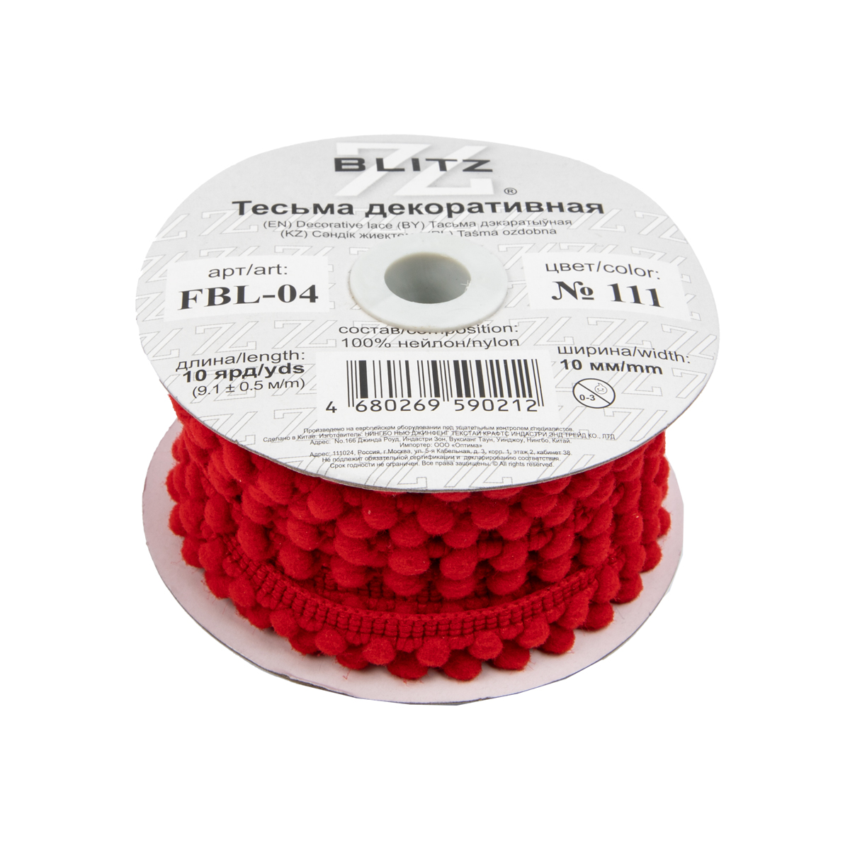 "BLITZ" тесьма декоративная FBL-04 10 мм 9.1 м ± 0.5 м №111 красный