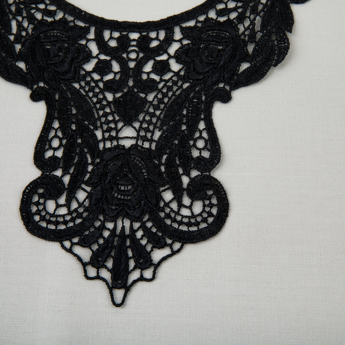 Вставка из гипюра состоит из выпуклых кружевных элементов, соединенных сетчатыми "связками". Вставка имеет ажурное плетение, что придает ему особый изыск.