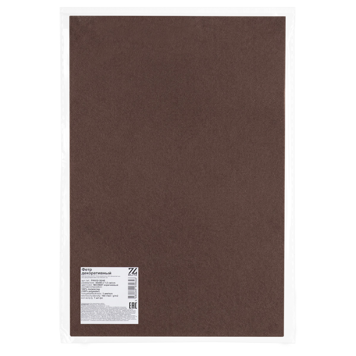 Фетр "BLITZ" FKH10-30/45 декоративный 1 мм 30 см х 45 см №CH687 коричневый