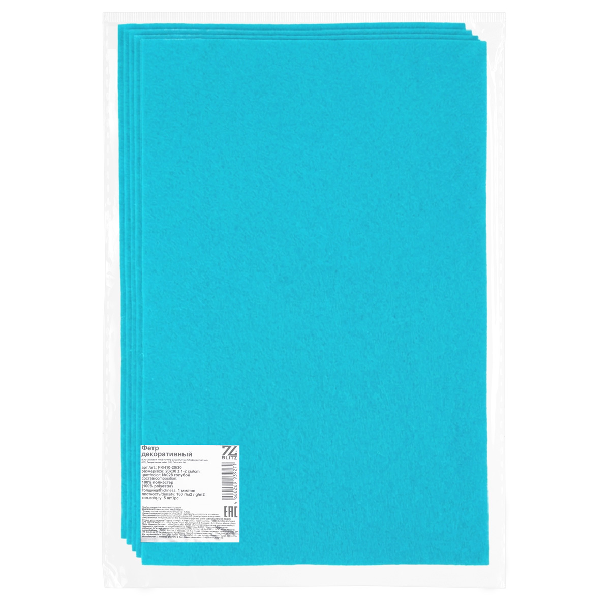 Фетр "BLITZ" FKH10-20/30 декоративный 1 мм 20 см х 30 см 5 шт №028 голубой