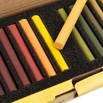 В составе художественной пастели "Аква-Колор" нет масла, воска, глины – только светостойкие пигменты, гуммиарабик и некоторые специальные добавки. Тонкий круглый мелок позволяет создавать четкие штрихи и выполнять крупные заливки. Пастель универсальны в применении, хорошо ложится на различные поверхности, может размываться водой.