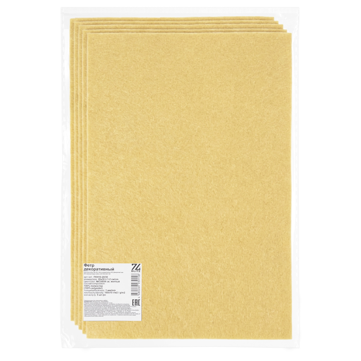 Фетр "BLITZ" FKH10-20/30 декоративный 1 мм 20 см х 30 см 5 шт №CH654 св. желтый
