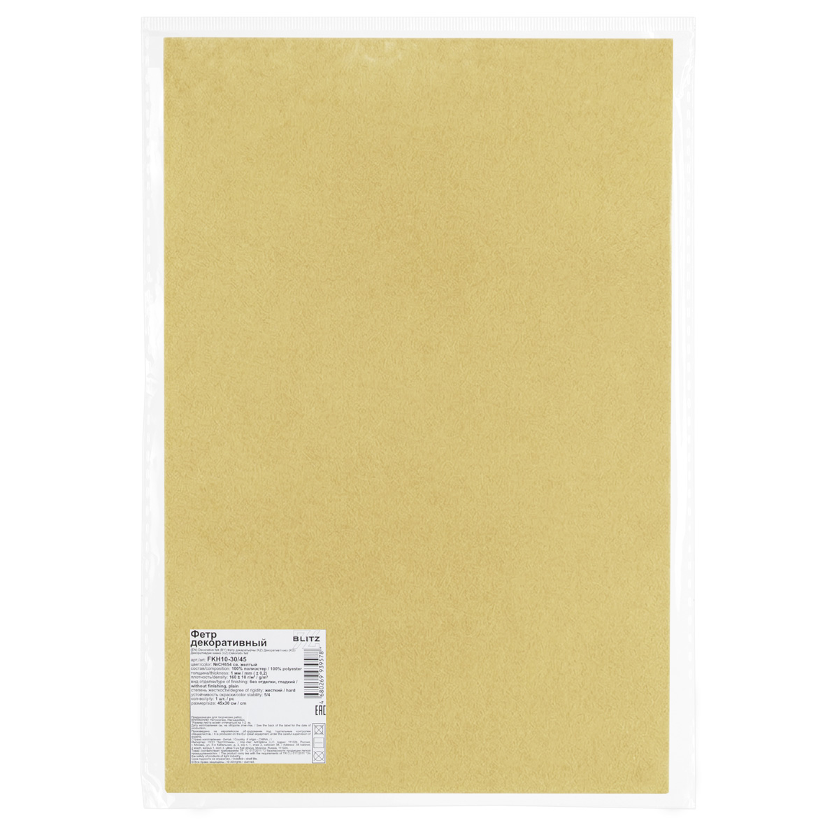 Фетр "BLITZ" FKH10-30/45 декоративный 1 мм 30 см х 45 см №CH654 св. желтый